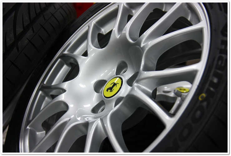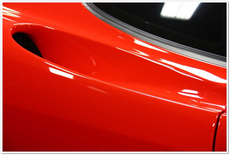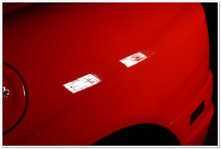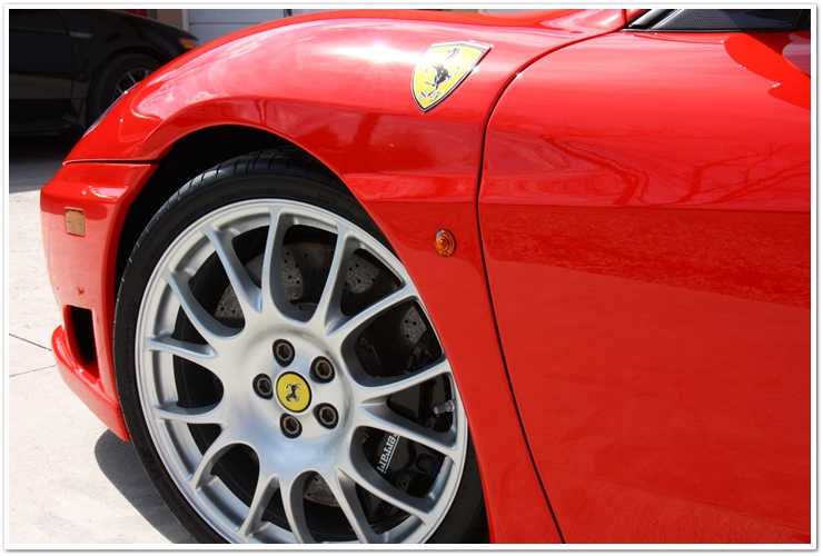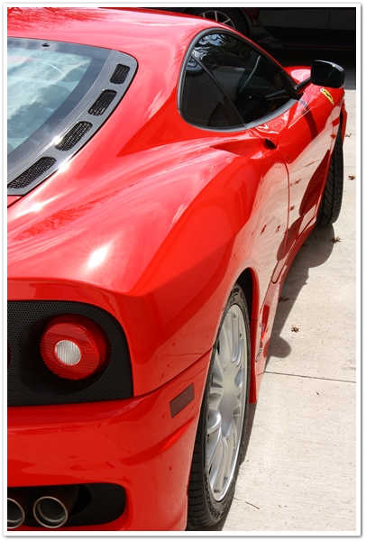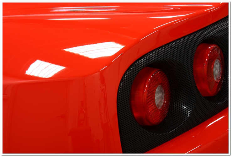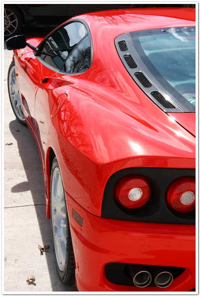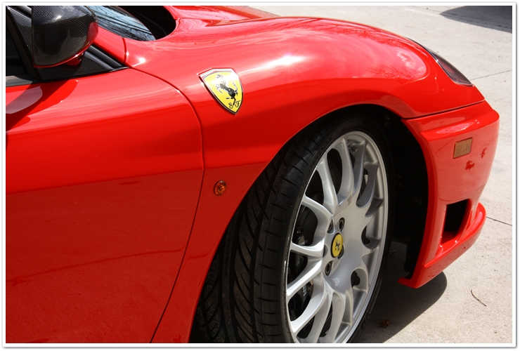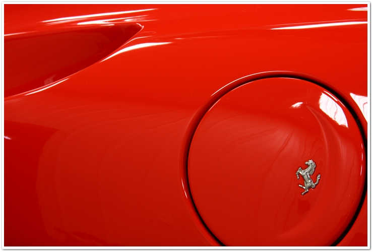Majoritatea masinilor Ferrari pe care le vezi sunt de o culoare numita Rosso Corsa. Aceasta masina este insa Rosso Scuderia, o culoare mult mai stralucitoare si vibranta. Imi place sa o numesc “rosu aresteaza-ma”. Cand este complet nivelata si polishata, aceasta culoare te lasa pur si simplu fara respiratie. Insa cand este acoperita de zgarieturi ca in poza de mai sus, i se schimba destul de mult aspectul.