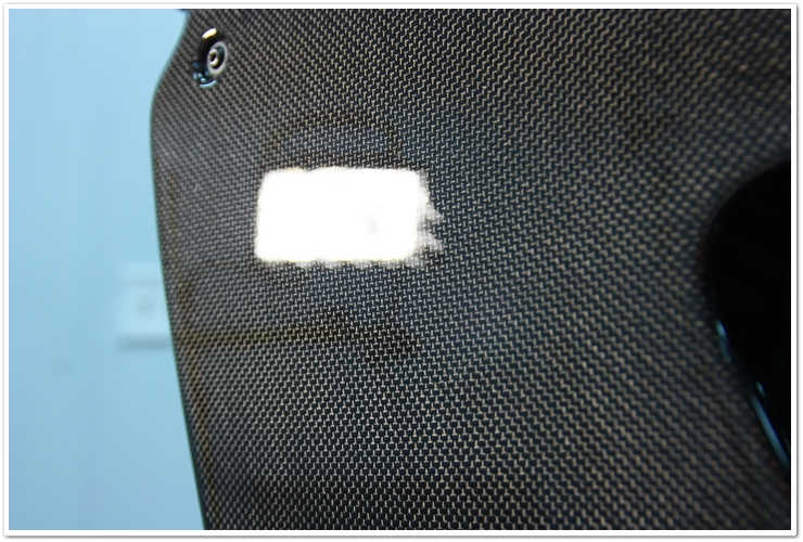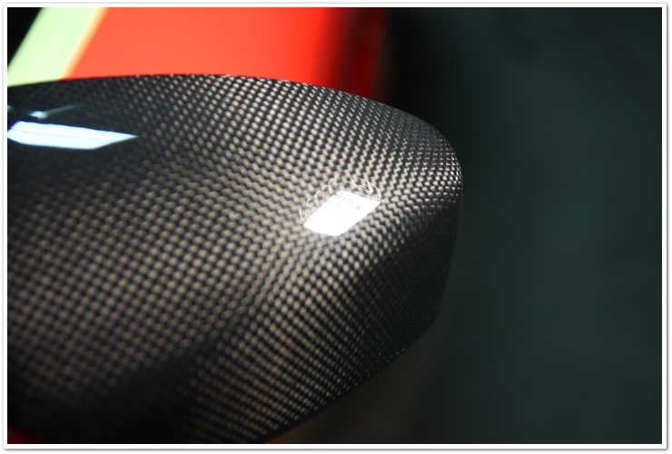 Oglinzile din fibra de carbon au fost polishate pentru a indeparta zgarieturile si defectele usoare de asemenea. Aici folosesc masina Porter Cable, pad-ul alb si Meguiars M205. De asemenea, observati cum tin cu mana partea de sus a masinii de polishat, pantru ca mana mea sa constituie o bariera intre masina si stalpii masinii. In zone stramte cum este aceasta, vrei sa te asiguri ca nu loviti zonele care se pot sgaria usor cu masina de polish.