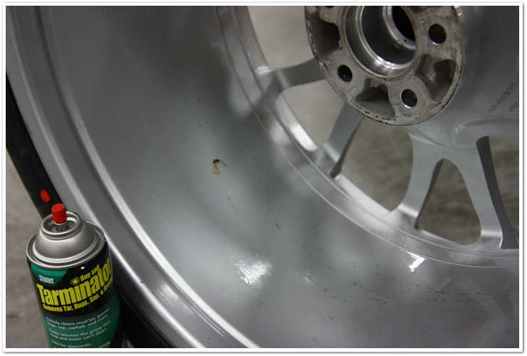 Pentru reziduurile care au ramas, pulverizez putin Stoner’s Tarminator si las cateva momente sa topeasca/desprinda cauciucul/gudronul/adezivul inainte de a sterge. Dupa aceea, voi pulveriza putin P21S TAW pe roti pentru a indeparta orice reziduuri lasate de Tarminator, si pentru a pregati suprafata pentru aplicarea sealant-ului.