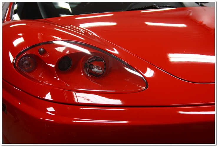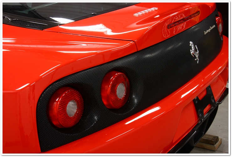 Cele mai multe masini Ferrari sunt destul de dificile in timpul corectiei vopselii, pur si simplu din cauza tuturor curbelor, unghiurilor si a formei generale a masinii. Necesita mult mai mult timp decat ar necesita o masina “normala”. Cand lustruesti un Ferrari, trebuie sa nu te grabesti deoarece exista multe curbe in jurul carora trebuie sa manevrezi masina de polishat. OK, acesta a fost un sfat important, asa ca…sa trecem mai departe. Iata o alta poza inainte si dupa; de data aceasta a barei de protectie din spate. Deoarece toata lumea are tendita sa frece aceste zone intr-o maniera agresiva in timpul spalarii si uscarii pentru a urma forma barei, exista aproape intotdeaua zgarieturi mai profunde pe toata suprafata barii, dintr-o parte in cealalta. De multe ori aceste zgarieturi sunt prea adanci pentru a putea fi indepartate in siguranta, insa daca putem scoate majoritatea dintre ele, vor ajunge sa arata mult, mult mai bine dupa aceea.