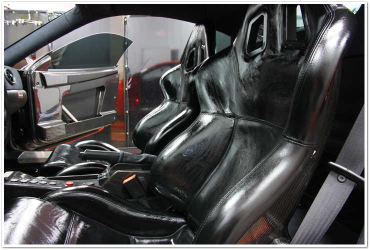 In interesul de a mentine un flux de lucru eficient in ceea ce priveste aceasta masina, ma reped la piele inainte de a incepe procesul de polish. Dupa o scurta inspectie, am observat ca aceasta piele neagra are cateva pete de luciu, indicand ca are o mare nevoie de o curatare si conditionare. Pielea, in starea sa naturala, are un aspect mat, si atunci, cand vedeti o pata de luciu (in special in zonele de uzura cum ar fi sezutul) este din cauza anumitor uleiuri, a transpiratiei sau a murdariei care s-a imbibat in suprafata si au devenit lustruite, ca sa spunem asa. Pentru a restaura luciul natural si catifelarea pielii, o aplicare completa de Leatherique era in meniu. Este un sistem compus din doua parti, in care in prima etapa (Rejuvinator Oil) este aplicat din belsug si apoi masat in piele cu mana. Acest stadiu profund de curatare si conditionare are nevoie de timp (cel putin 8 ore…insa eu de obicei il las 24 – 48 de ore), asa ca cel mai indicat ar fi sa incepi acest proces dimineata devreme, si in momentul in care ai terminat cu restul masinii, sa te intorci pentru a continua tratamentul cu Prestine Clean, cea de-a doua parte a acestui sistem. Din moment ce Ferrari vine cu un foarte frumos manual de utlilizare cu coperti de piele, aplic si acestora un tratament cu Leatherique pentru a le proteja si a le conserva cat mai bine. In fotografia de mai jos, poti vedea pielea inmuiata in Leatherique Rejuvinator Oil: