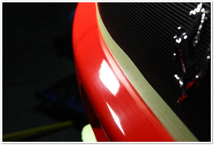Acum ca procesul de curatare a pielii este in lucur, este in sfarsit timpul sa ma apuc de polish. Dupa inspectia cu lumini cu halogen, am putut vedea adevarata conditie a vopselii vechi de 6 ani de pe Stradale. Uitandu-te la pozele de mai jos, poti vedea ca este o cantitate moderata de zgarieturi tip vartejuri si cateva zgarieturi usoare, ceea ce nu este neobisnuit. Luand in considerare experienta mea in ceea ce priveste vopseaua de pe Ferrari, deja aveam o idee clara in legatura cu combinatiile de polish, pad-urile si instumentele de care as avea nevoie pentru a readuce la viata aspectul final al masinii. Acesta este momentul in care un detailer profesionist poate evalua cu adevarat nivelul de degradare si de a stabili o buna derulare a actiunii. Regula generala este aceea de a alege metoda cea mai putin agresiva pentru a obtine rezultatele asteptate, tinand cont de faptul ca protejarea stratului de la suprafata este intotdeauna o prioritate. Cu acest nivel de defecte si tinand cont de duritatea pe care o are vopseaua de pe Ferrai, am stiut ca este nevoie de o abordare mai agresiva in stadiul initial pentru a reduce stratul de vopsea atat cat vreau eu sa fie redus. De asemenea, masor incontinuu grosimea stratului de vopsea cu masuratorul meu de vopsea pentru a ma asigura ca fiecare portiune are o grosime suficienta pentru a putea lucra si pentru a monitoriza cat din stratul de suprafata este indepartat. Iata cum arata finishul sub lumina unei lampi cu halogen: