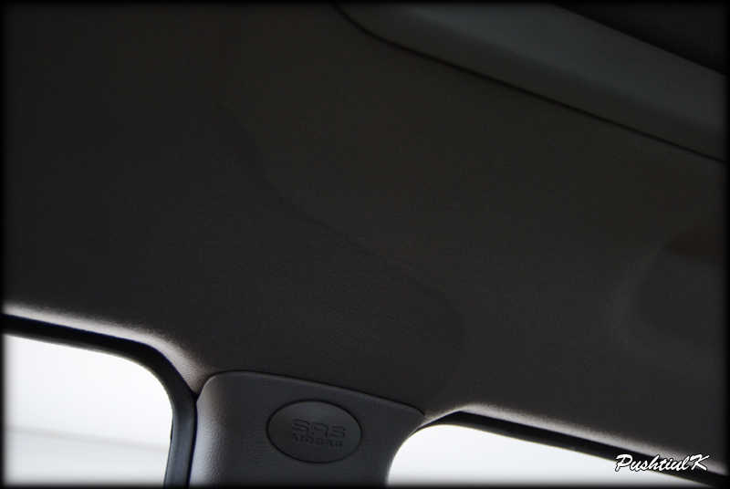 Dupa curatarea portiunilor din piele, tot interiorul a fost aspirat. Plafonul a fost curatat folosind Tornador Gun si Mafra Pulimax (dilutie 1:10). Mai jos, puteti vedea o poza cu o portiune din plafon 50% / 50% (partea stanga curatata, partea dreapta necuratata):