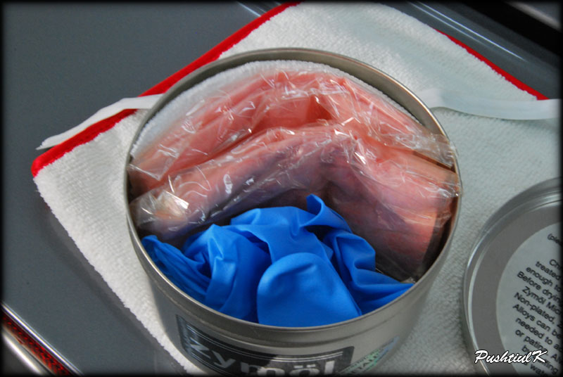 Ambalajul este unul frumos, demn de numele Zymol. Continutul Zymol Metal este format din 2 servetele, 1 pereche manusi protectie si un servetel pentru lustruire. Dupa cum vedeti si in poza, acele 2 servetele portocalii sunt servetele impregnate cu solutia Zymol Metal.