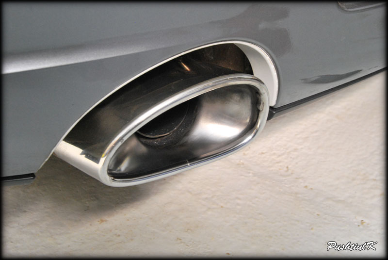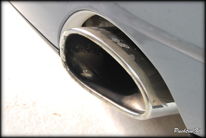 Si acum la treaba. Am ales evacuarea din dreapta pentru a o curata cu Zymol Metal, si pe cea din stanga pentru P21S Multi-Surface Finish Restorer. Evacuarea dreapta inainte de aplicarea Zymol Metal: